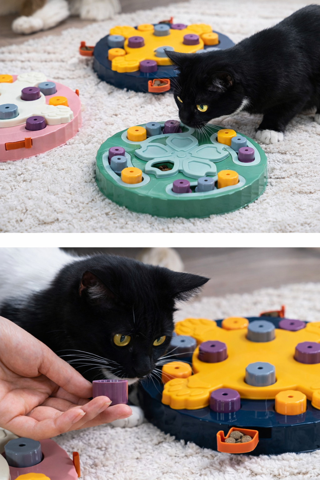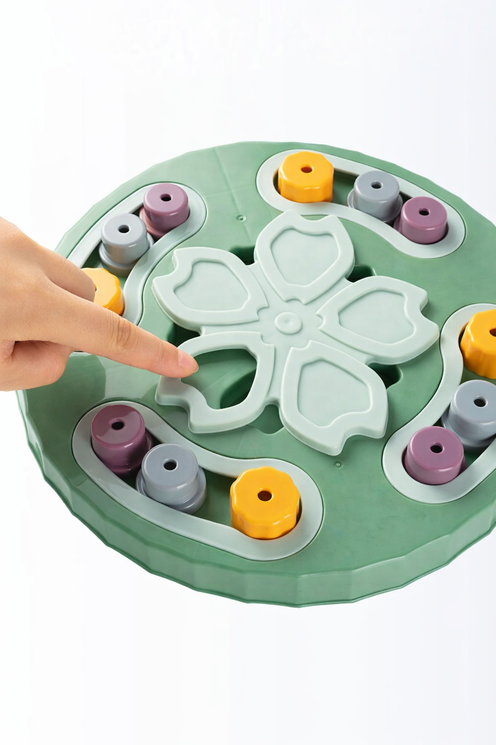 Fabricado com materiais resistentes e seguros, o produto não utiliza componentes elétricos nem substâncias químicas de alta preocupação, sendo indicado para uso diário. O sistema de compartimentos móveis incentiva o pet a explorar, pensar e se movimentar para liberar o alimento, auxiliando no controle da velocidade de ingestão e na prevenção de problemas digestivos.